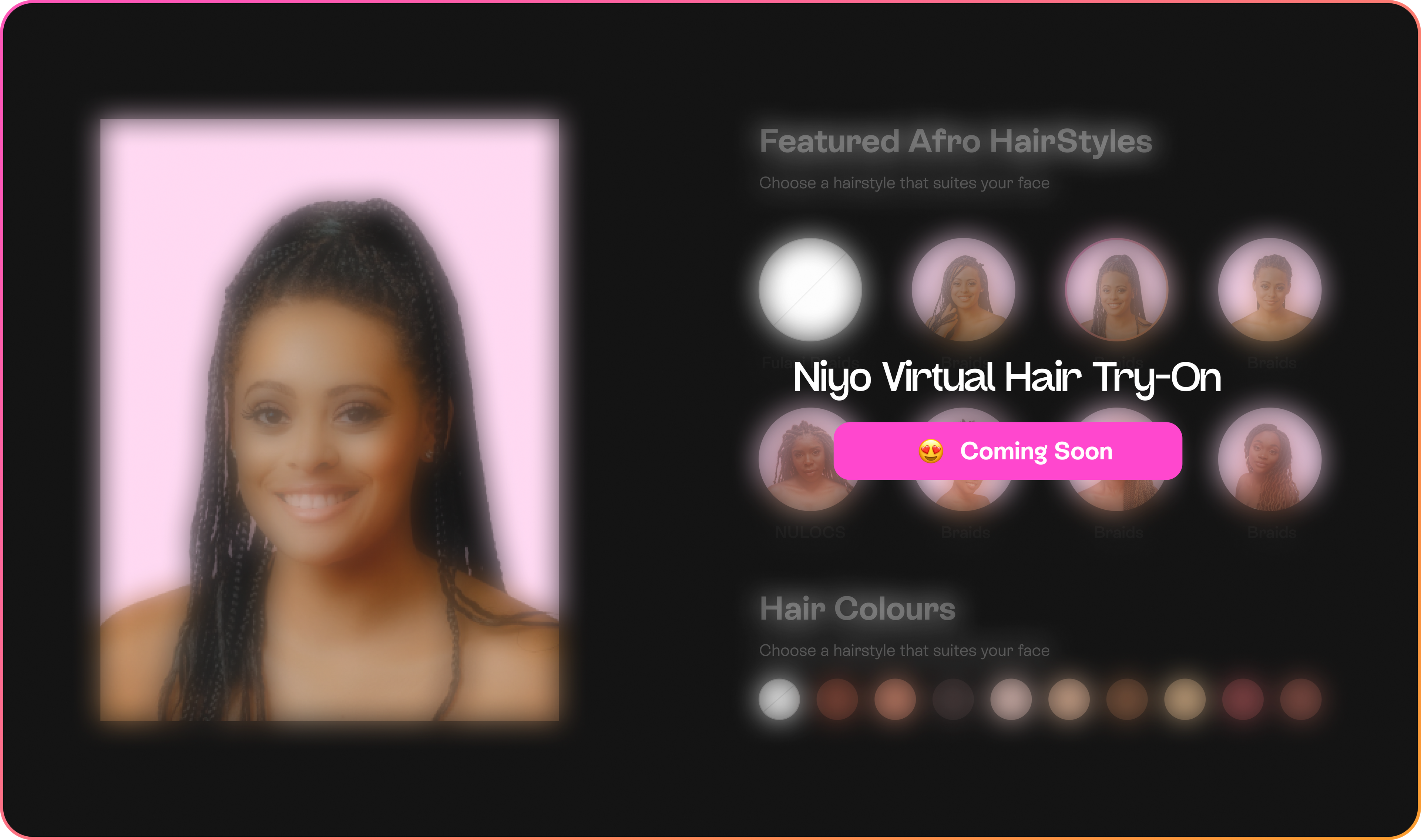 This feature is coming soon. Niyo Hair Try-on is an AR feature technology that allows you to tryon on any hairstyle in a 3d mode. You will pick the hairstyle that suits you, see how it will look on you, take a picture and book an appointment.